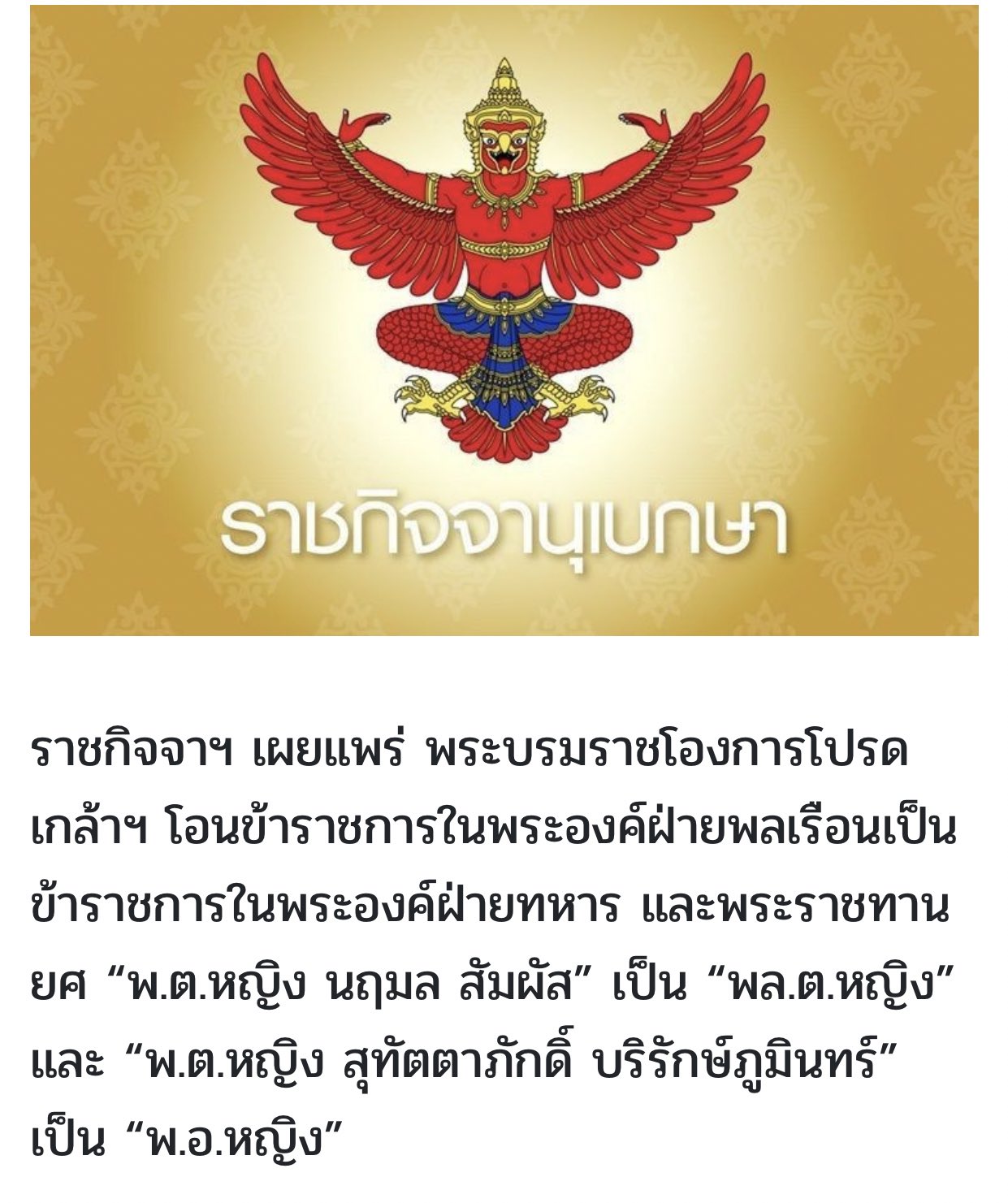 โปรดเกล้าฯ พระราชทานยศทหารชั้นนายพล 'พลตรีหญิงสุทัตตาภักดิ์ บริรักษ์ภูมินทร์' และพระราชทานยศทหารสัญญาบัตร 8 นาย โปรดเกล้าฯ พระราชทานยศทหาร.